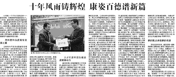 報(bào)道從公司的科研成果、改革創(chuàng)新精神、人才引進(jìn)和團(tuán)隊(duì)建設(shè)、主題活動(dòng)、未來憧憬等方面,反映了公司成立10年來所取得的一系列驕人業(yè)績和公司發(fā)展過程中形成并堅(jiān)持的品質(zhì)精神、價(jià)值理念、管理運(yùn)營模式。這是該報(bào)為公司10周年華誕送上的一份大禮,必將激勵(lì)全體康姿百德人在新的起點(diǎn)上振奮精神、開拓進(jìn)取,取得新的更大的業(yè)績。