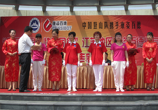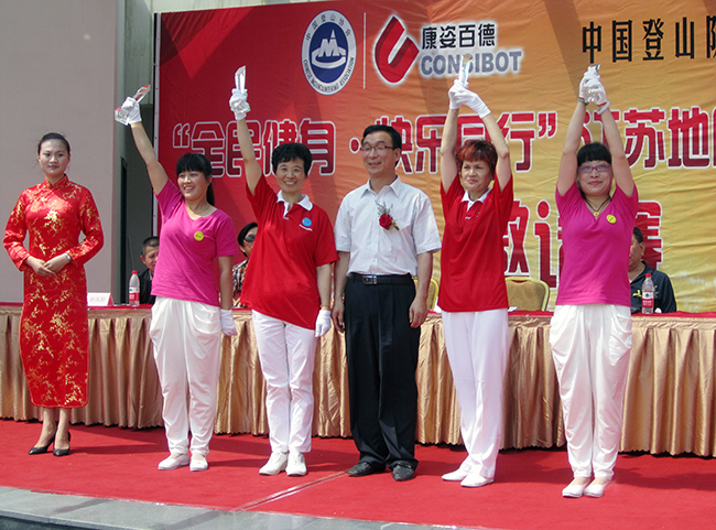 5月25日上午11時,中國登山隊攜手康姿百德舉辦的“全民健身·快樂同行”康姿百德第二套健身操邀請賽江蘇地區(qū)比賽在江蘇太倉舉行。來自江蘇各地區(qū)的18個代表隊共計600余名健身愛好者參加了此次比賽。 參加此次比賽的主要嘉賓有:中國登山協(xié)會副會長楊文祥、原張家港工商局局長焦兀、太倉市城廂鎮(zhèn)工商分局書記楊振華、太倉市保護消費者協(xié)會秘書長鄒雁、太倉曲藝指導委員會秘書長徐兆群、康姿百德公司董事長、總經(jīng)理李銀祥等。 中國登山隊攜手康姿百德“全民健身·快樂同行”大型公益活動,于2012年在全國開展以來,受到了社會各方面的廣泛關(guān)注。為了將“全民健身·快樂同行”大型公益活動進一步引向深入,讓更多的人走出家門,參加全民健身運動,中國登山隊,秦皇島康姿百德高新技術(shù)開發(fā)有限公司,決定聯(lián)合舉辦“全民健身·快樂同行”康姿百德健身操邀請賽,江蘇地區(qū)是本次邀請賽初賽的第一站。 在比賽中,身著紅色演出服的青年歌手楊德朗站在車上出場,演唱了他的原創(chuàng)歌曲《最美中國人》。這首歌曲是康姿百德第二套健身操的背景音樂之一,全體參賽的健身愛好者隨著音樂而舞動,統(tǒng)一的著裝、整齊的動作、飽滿的熱情,將本次比賽推向了高潮。 經(jīng)評比,18個代表隊分獲“最佳表演獎”、“團隊建設(shè)獎”、“最佳組織獎”等獎項,這些健身操愛好者將在9月份來到秦皇島參加“全民健身·快樂同行”康姿百德健身操邀請賽的展演,勢將引起新一輪的康姿百德健身熱潮。