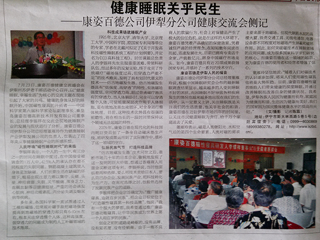 7月23日,康姿百德健康交流盛會(huì)在新疆伊犁州蘇伊老干部活動(dòng)中心舉行,以“健康睡眠、幸福生活”為核心的交流主題引起了與會(huì)代表的共鳴。中國(guó)磁性寢具的開(kāi)拓者—第六屆中國(guó)科學(xué)家論壇副理事長(zhǎng)、秦皇島康姿百德高新技術(shù)開(kāi)發(fā)有限公司董事長(zhǎng)、總經(jīng)理李銀祥就健康睡眠產(chǎn)業(yè)的發(fā)展與現(xiàn)狀進(jìn)行了深入分析。康姿百德公司伊犁分公司總經(jīng)理董雁玲向與會(huì)代表交流了從事健康睡眠產(chǎn)業(yè)四年來(lái)的所感所想。7月24日《伊犁晚報(bào)》對(duì)此次會(huì)議作了題為“健康睡眠、關(guān)乎民生”的專題報(bào)道。