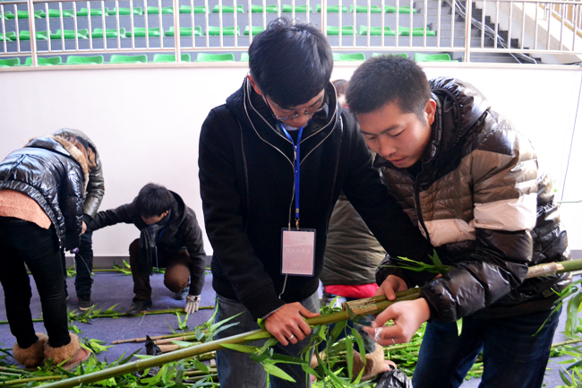 青脆的竹葉是志愿者一個(gè)一個(gè)粘到竹竿上的