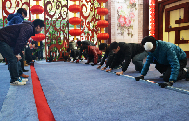 細(xì)節(jié)無處不在——志愿者悉心平整、粘合舞臺(tái)地毯