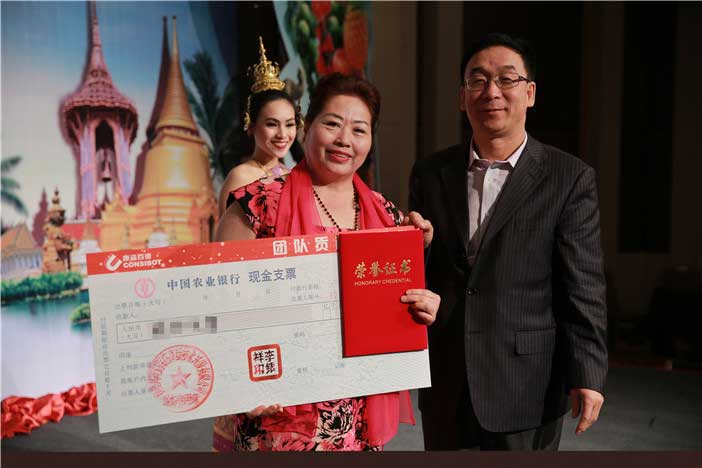 李總為榮獲團(tuán)隊(duì)貢獻(xiàn)獎(jiǎng)的經(jīng)銷(xiāo)商頒獎(jiǎng)