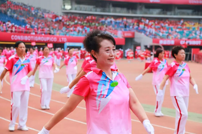 緊接著重頭戲來了~選手們踏著輕盈、整齊的步伐,伴著美妙的音樂,舞動起了康姿百德第六套健身操。整齊劃一的動作、矯健優(yōu)美的姿態(tài)贏得了觀眾們的陣陣喝彩。