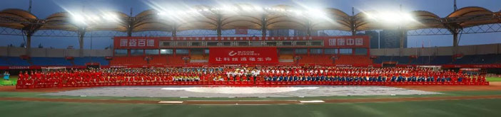伴隨著優(yōu)美激昂的《走向復興》音樂,一幅寫有“讓科技造福生命”、面積為608平方米的巨型紅旗步入賽場??底税俚?1名工作人員共舉旗幟,整齊自如地緩緩前行,給人以極大的視覺沖擊!