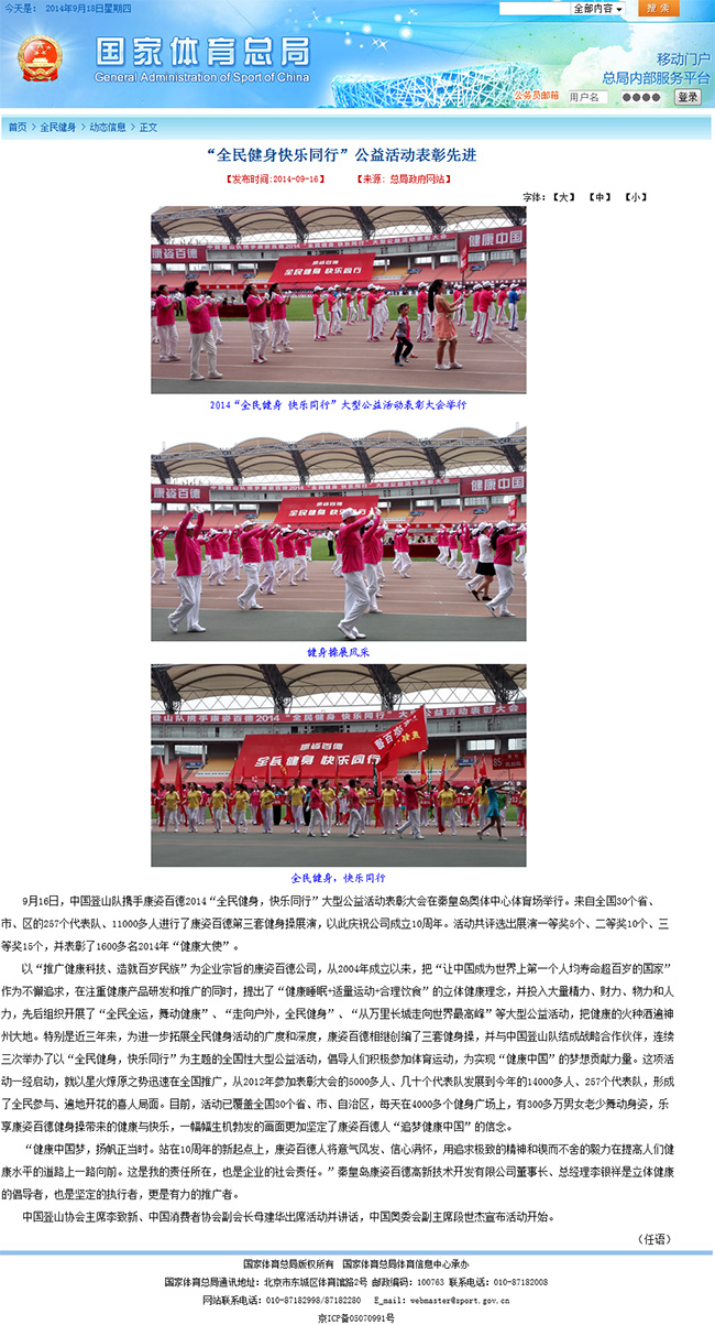 國家體育總局官網(wǎng)以《“全民健身快樂同行”公益活動表彰先進(jìn)》為題,對中國登山隊攜手康姿百德2014“全民健身 快樂同行”大型公益活動表彰大會進(jìn)行報道。