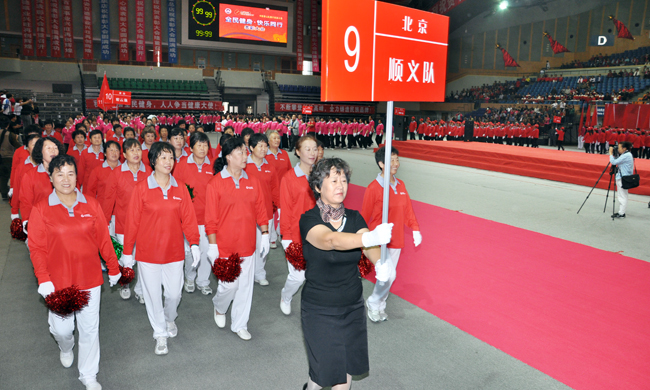 北京昌平隊 從選拔、備戰(zhàn)到今天的總決賽,一路走來,參賽隊員們的動作越來越熟練,越來越標(biāo)準(zhǔn),團(tuán)隊凝聚力越來越強(qiáng)。這些活力十足的中老年朋友并沒有滿足于越跳越熟練這一標(biāo)準(zhǔn),不少參賽隊伍在原有健身操基礎(chǔ)上又添加了一些新的成分。充滿個性的隊名、色彩鮮艷的運(yùn)動裝、揮舞的彩旗等創(chuàng)意,在總決賽的舞臺上給所有觀眾打造了一臺視覺盛宴,讓參賽節(jié)目更有看頭。賽場上,參賽隊員的展示非常到位,微笑始終掛在臉上,就連賽前的口號都是精心準(zhǔn)備、反復(fù)推敲。活力無限的她們感染了舞臺下的每一位觀眾,現(xiàn)場觀眾都在用自己最熱烈掌聲、最大的歡呼聲表達(dá)著對參賽選手的喜愛和尊重。 |