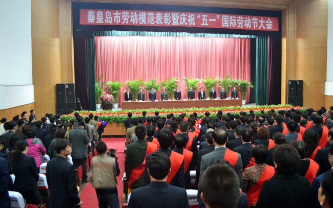 與會(huì)領(lǐng)導(dǎo)與全體勞模齊唱國歌
