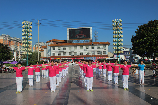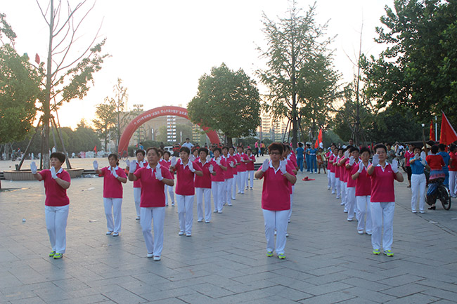為深入推廣“全民健身”活動(dòng),8月12日,江蘇邳州體育局組織廣大健身愛好者舉行了廣場舞表演,近200人組成的康姿百德健身操代表隊(duì)深受廣大市民好評(píng)。 上午8時(shí),邳州人民廣場上,一群身穿粉紅色T恤衫的人們,精神飽滿,意氣風(fēng)發(fā),隨著音樂的旋律,富有節(jié)奏地伸臂踢腿,提臀扭腰,盡情展現(xiàn)著康姿百德健身操的明快與活力。大家獨(dú)具一格的表演,為本次活動(dòng)構(gòu)筑了一道亮麗的風(fēng)景線,引得廣大市民駐足觀賞、一致叫好。