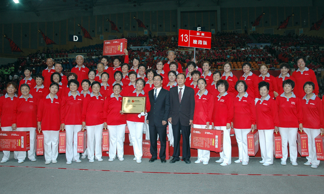 中國消費(fèi)者協(xié)會(huì)副會(huì)長母建華、康姿百德公司董事長李銀祥與健身操比賽一等獎(jiǎng)獲得者山東濱州晚霞隊(duì)隊(duì)員合影