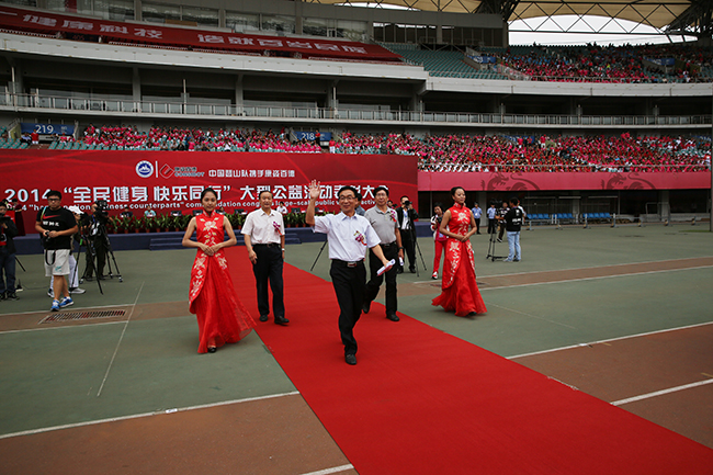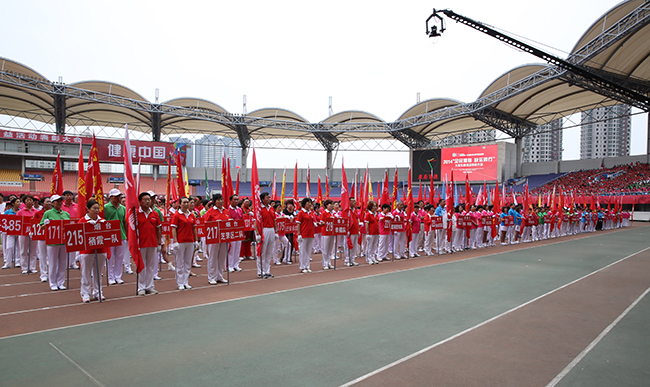 為全面展示康姿百德2014“全民健身快樂同行”大型公益活動的成果,進(jìn)一步把全民健身活動引向深入,來自全國各地的257個代表隊、11000多人進(jìn)行了氣勢恢宏的康姿百德健身操展演。伴隨著耳熟能詳?shù)男桑鞔黻犚来稳雸?,一面面隊旗迎風(fēng)高揚,一排排隊伍整齊劃一,節(jié)奏明快的旋律和優(yōu)美舒暢的動作有機(jī)融合,彰顯出了“我運動、我健康、我快樂”的健身風(fēng)采和大家對幸福生活的追求,把人們帶入了一個五彩繽紛的歌舞世界。晚上7點30分,經(jīng)過6個多小時的展演,活動在燈火閃爍的夜色中緩緩落幕。