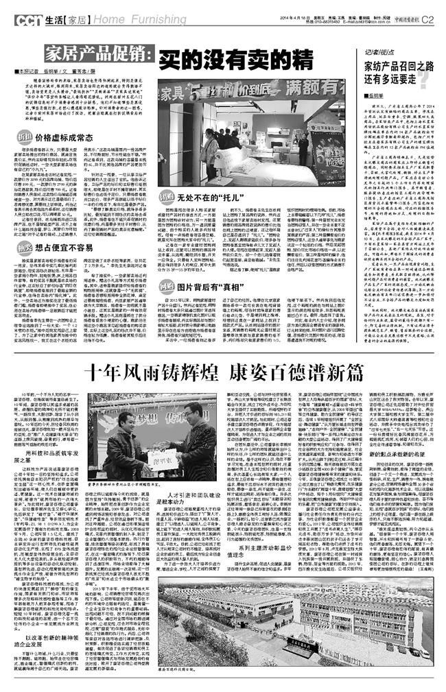 在康姿百德公司成立10周年之際,《中國消費者報》2014年4月18日C2版,用1/2的版面對康姿百德公司10年來的發(fā)展情況進行了客觀系統(tǒng)的報道。 報道從公司的科研成果、改革創(chuàng)新精神、人才引進和團隊建設(shè)、主題活動、未來憧憬等方面,反映了公司成立10年來所取得的一系列驕人業(yè)績和公司發(fā)展過程中形成并堅持的品質(zhì)精神、價值理念、管理運營模式。這是該報為公司10周年華誕送上的一份大禮,必將激勵全體康姿百德人在新的起點上振奮精神、開拓進取,取得新的更大的業(yè)績。