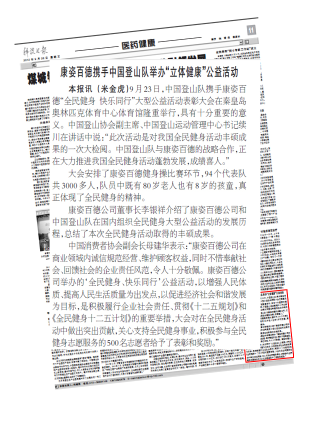 2012年9月28日《科技日?qǐng)?bào)》在第十一版《醫(yī)藥健康》以《康姿百德攜手中國(guó)登山隊(duì)舉辦“立體健康”公益活動(dòng)》為題,刊登了我司在秦皇島奧林匹克體育中心舉行“全民健身 快樂同行”大型公益活動(dòng)表彰大會(huì)的盛況。