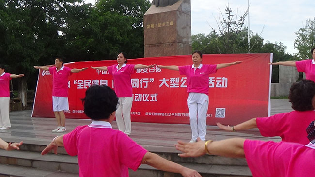 2014年8月9日,第六個“全民健身日”剛過,在各地群眾正以前所未有的熱情掀起新一輪全民健身熱潮的時候,四川德陽康姿百德戶外健身營組織當?shù)亟∩韾酆谜?,在珠江橋鄧小平廣場舉行了2014“全民健身 快樂同行”大型公益活動德陽地區(qū)啟動儀式,號召廣大市民積極參加體育鍛煉,養(yǎng)成良好的生活習慣,真正形成全民健身、天天健身的濃厚氛圍。 啟動儀式上,200多名康姿百德健身營成員,表演了康姿百德健身操,以實際行動向人們傳遞著健康向上的正能量,把全民健身活動再次推向了高潮。前來觀看表演的觀眾普遍認為,康姿百德健身操有其與眾不同的特點,集傳統(tǒng)與現(xiàn)代、柔美與剛勁為一體,節(jié)奏明快,動作優(yōu)美,健身效果明顯,是人們健身鍛煉的最佳選擇項目,紛紛表示要加入到這個健身隊伍中來,為倡導健康文明新風貢獻一份力量。