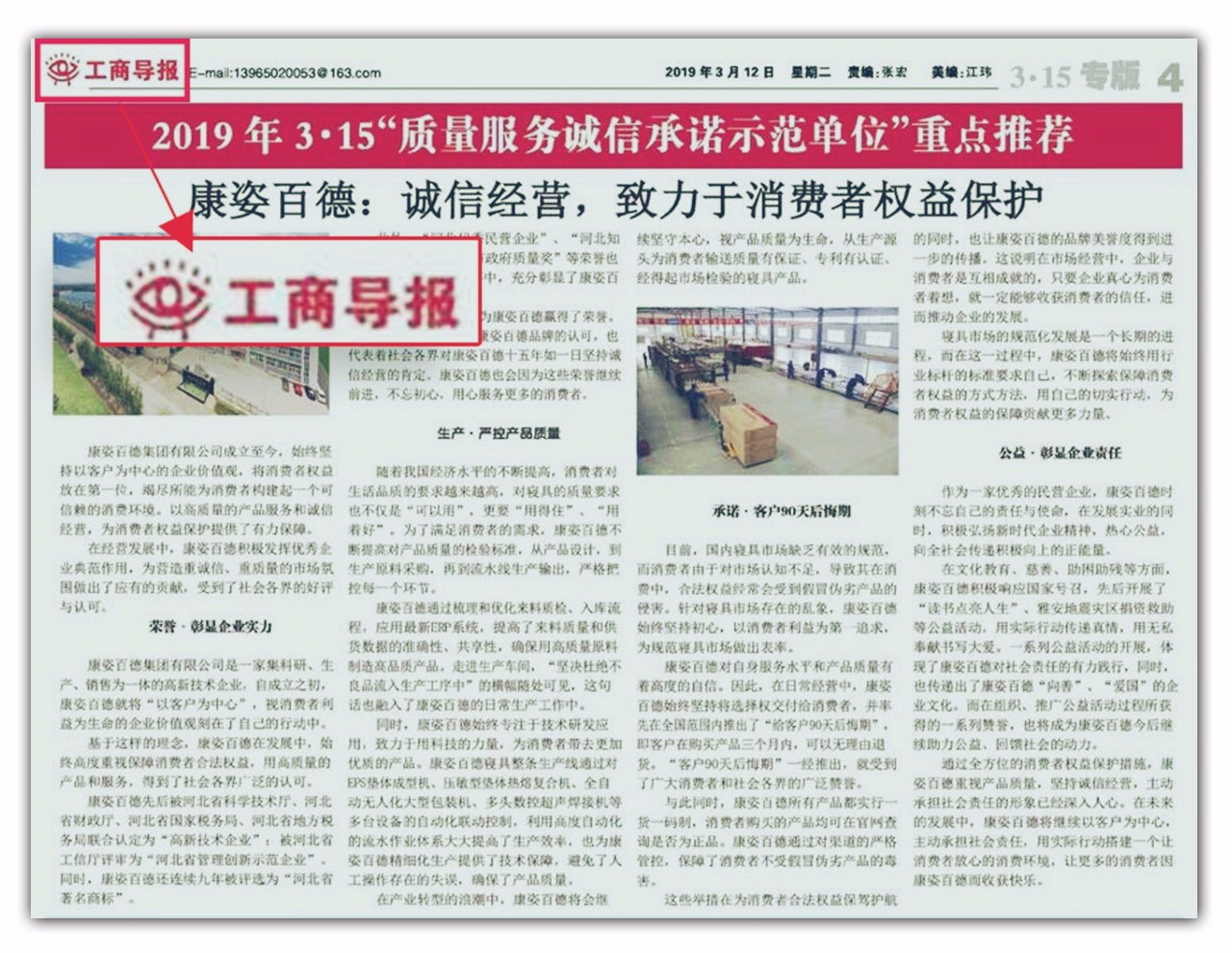 以下是安徽《工商導(dǎo)報(bào)》以“誠(chéng)信經(jīng)營(yíng),致力于消費(fèi)者權(quán)益保護(hù)”為主題對(duì)康姿百德的報(bào)道。