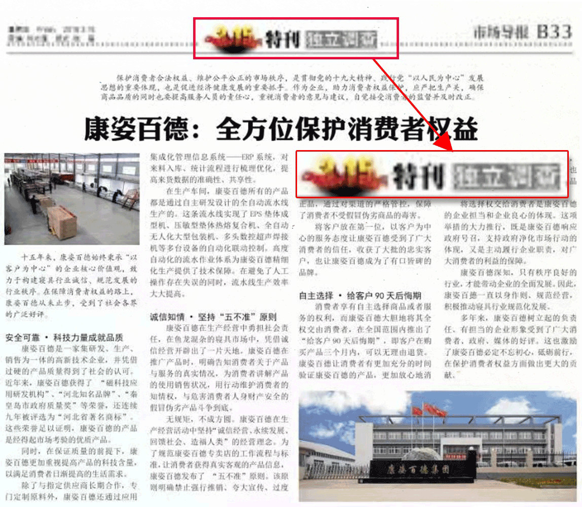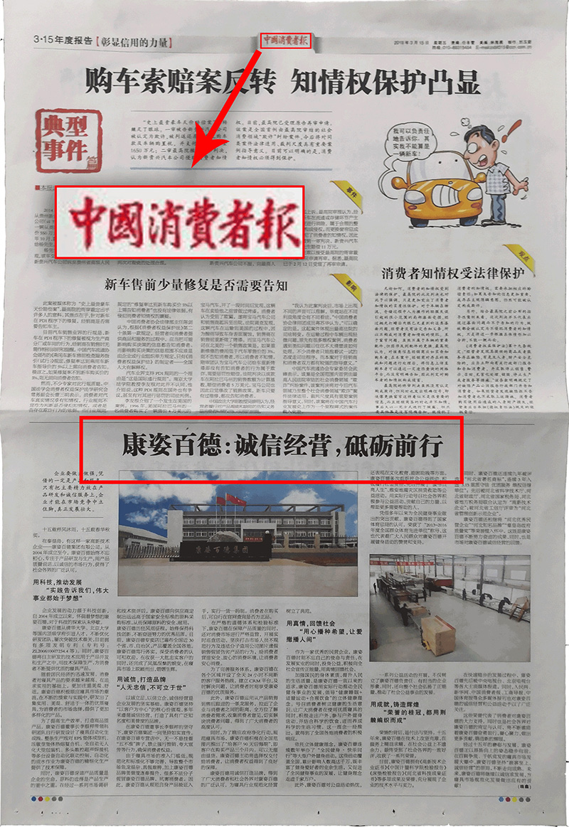 在3·15年度報(bào)告【彰顯信用的力量】專(zhuān)題中,《中國(guó)消費(fèi)者報(bào)》對(duì)康姿百德“九十天無(wú)理由退貨”等一系列誠(chéng)信經(jīng)營(yíng)、保護(hù)消費(fèi)者權(quán)益的行為進(jìn)行了專(zhuān)題報(bào)道。