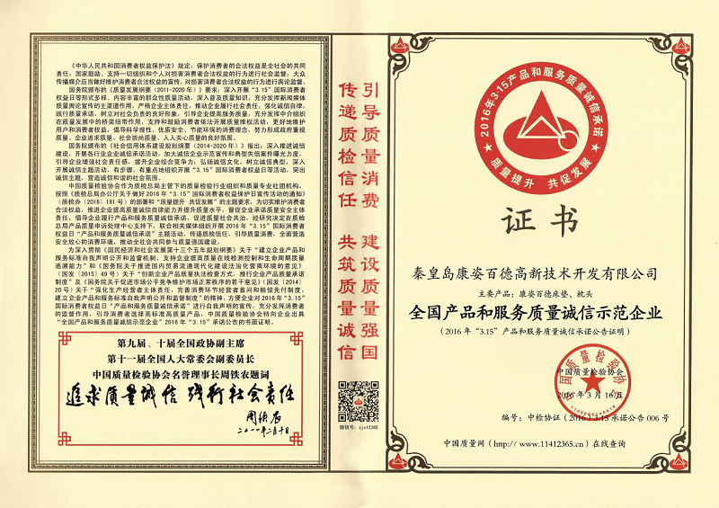 此外,康姿百德還分別榮獲3.15主題活動中“全國產(chǎn)品和服務(wù)質(zhì)量誠信示范企業(yè)”、“全國質(zhì)量檢驗穩(wěn)定合格產(chǎn)品”兩項榮譽。
