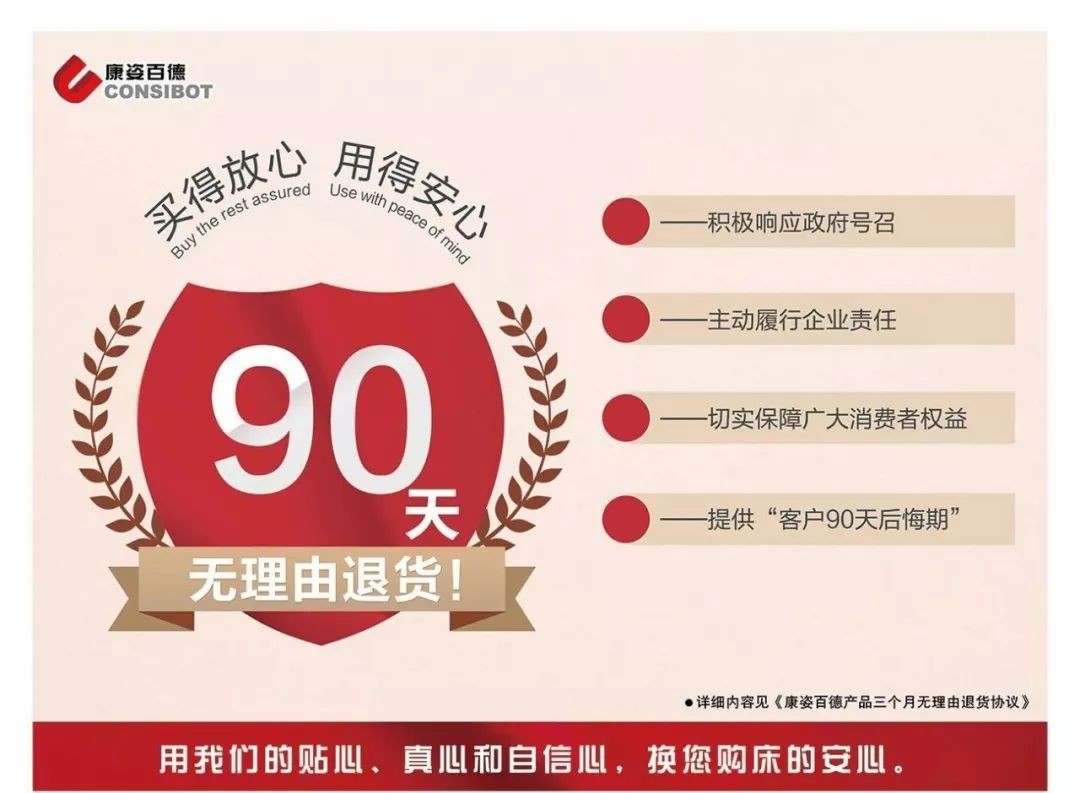 1.三個月無理由退貨,讓康姿百德的產(chǎn)品質(zhì)量和服務質(zhì)量,得到了進一步的提高。