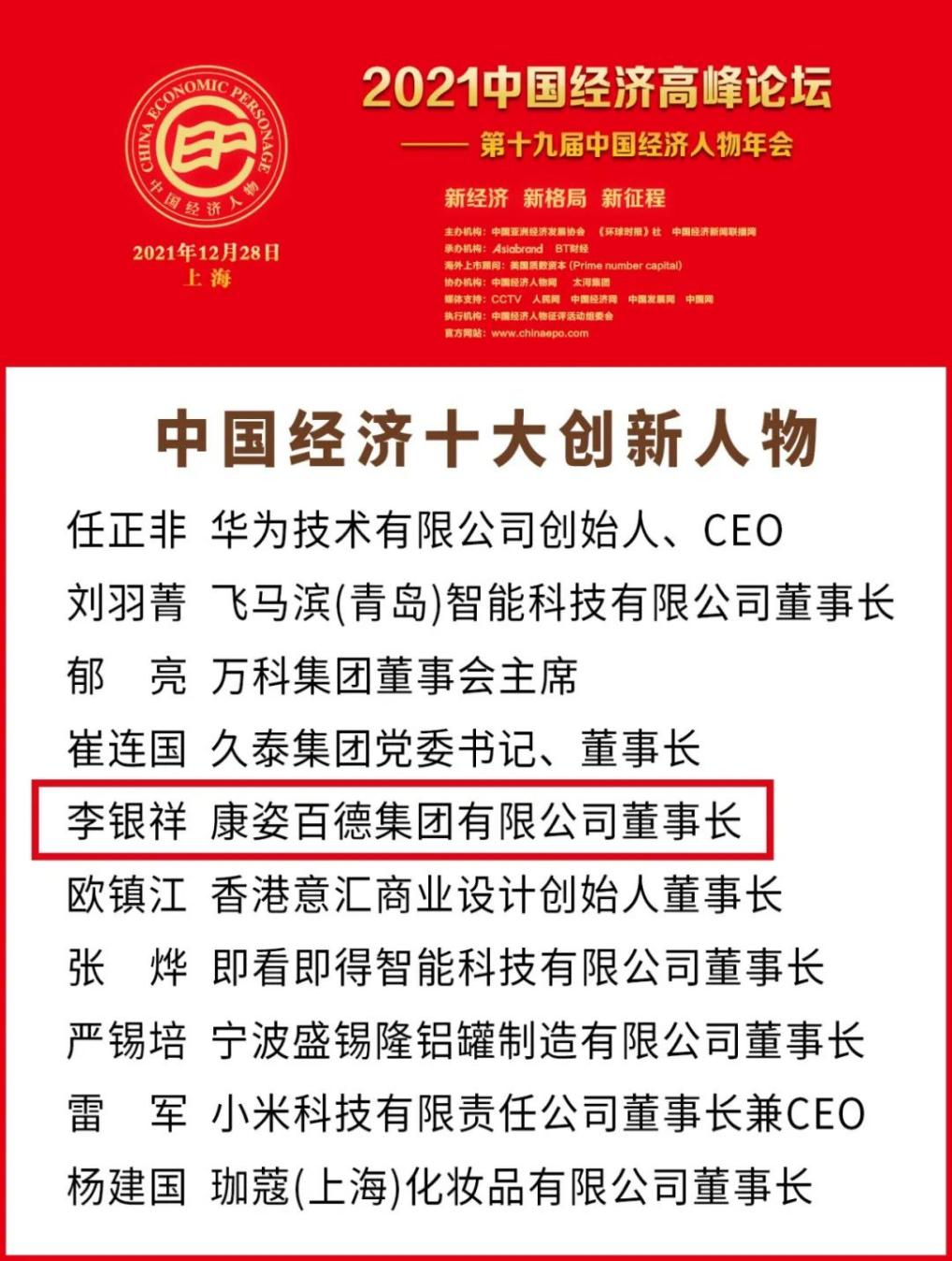 2021年12月28日,“2021中國經(jīng)濟(jì)高峰論壇暨第十九屆中國經(jīng)濟(jì)人物年會” 在上海成功舉行。本次活動由中國經(jīng)濟(jì)新聞聯(lián)播網(wǎng)、《環(huán)球時報》社、中國亞洲經(jīng)濟(jì)發(fā)展協(xié)會聯(lián)合主辦。康姿百德集團(tuán)董事長李銀祥榮獲“中國經(jīng)濟(jì)十大創(chuàng)新人物”榮譽稱號。