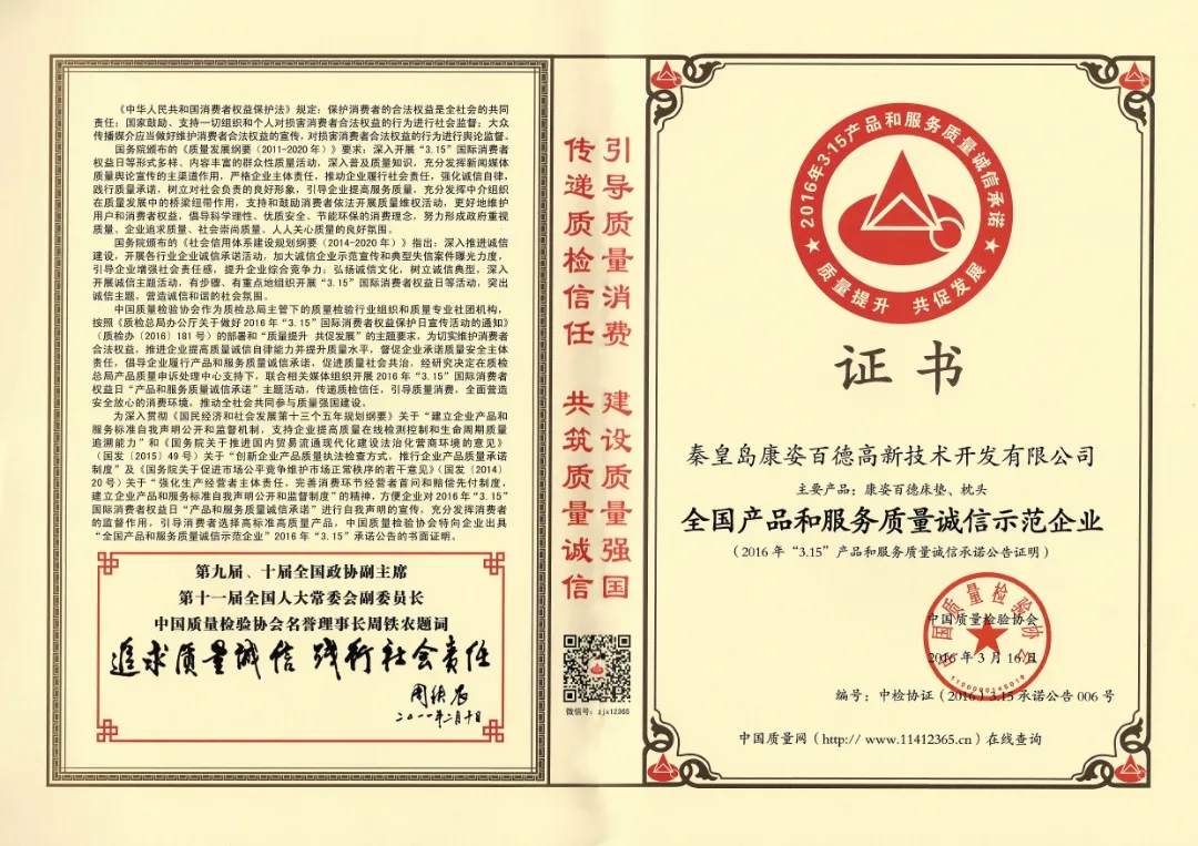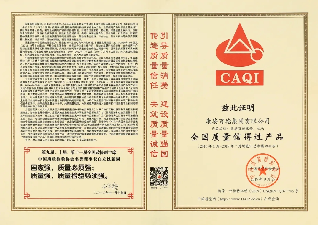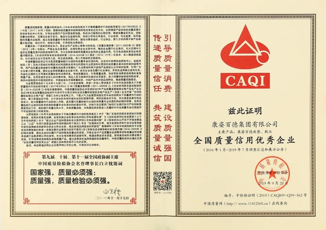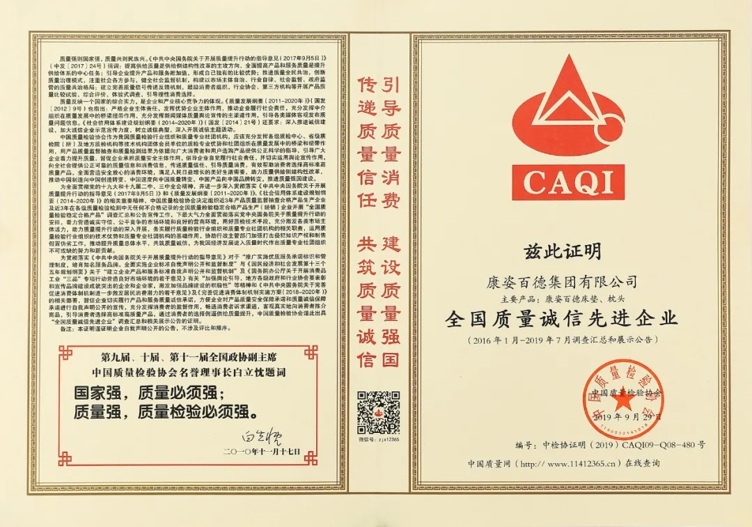 在李銀祥董事長的帶領(lǐng)下,康姿百德始終堅持誠信經(jīng)營,并先后榮獲了”全國產(chǎn)品和服務(wù)質(zhì)量誠信示范企業(yè)“、“全國質(zhì)量信用優(yōu)秀企業(yè)”、”全國質(zhì)量誠信先進(jìn)企業(yè)”、“全國質(zhì)量信得過產(chǎn)品”等多項(xiàng)榮譽(yù)。