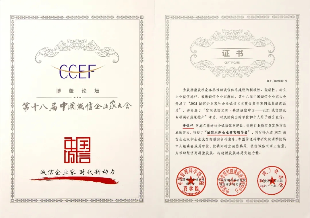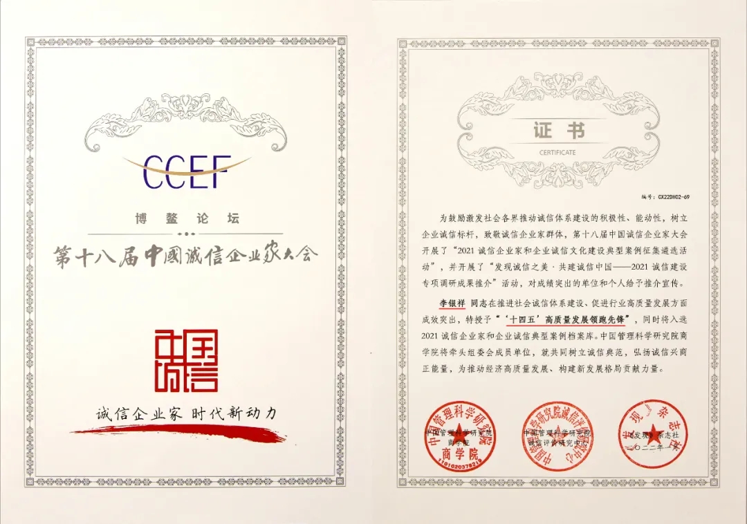 中國誠信企業(yè)家大會期間,經(jīng)中國管理科學(xué)研究院商學(xué)院學(xué)術(shù)委員會評定,李銀祥董事長還被聘任為中國管理科學(xué)研究院商學(xué)院“十四五”規(guī)劃編制專家組成員。