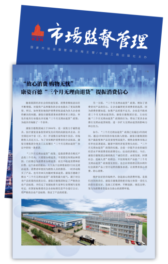 康姿百德在消費(fèi)者維權(quán)方面,積極響應(yīng)國家市場監(jiān)督管理總局的號(hào)召,自主在行業(yè)內(nèi)推行“三個(gè)月無理由退貨”政策,并被先后刊登在《市場監(jiān)督管理》雜志上3次。