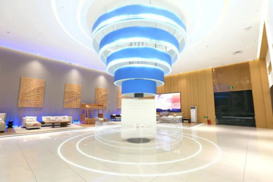 科技展廳的產(chǎn)品展示區(qū),以“科技感”與“舒適睡眠”為設(shè)計(jì)導(dǎo)向,圍繞“溫暖”“家”“科技”幾個(gè)核心元素,實(shí)現(xiàn)了科技元素與家居生活的有機(jī)結(jié)合,構(gòu)建一個(gè)家庭場(chǎng)景式的沉浸空間,一個(gè)有溫度的展示環(huán)境。