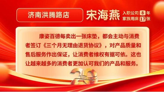宋海燕表示,因為在康姿百德這樣一個講誠信、負責(zé)任的企業(yè)工作,讓廣大消費者都更加信任她,這讓宋海燕也非常自豪。她也表示,作為康姿百德的一員,今后,會以更加飽滿的熱情和責(zé)任心,全心全意地服務(wù)好每一位客戶,讓大家都能感受到她的真心和誠意。