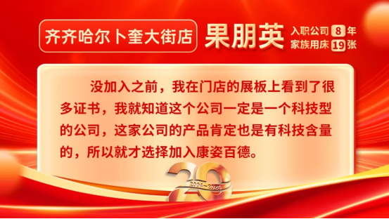 談到為什么加入康姿百德,果朋英說道:“沒加入之前,我在門店的展板上看到了很多證書,我就知道這個公司一定是一個科技型的公司,這家公司的產(chǎn)品肯定也是有科技含量的,所以就才選擇加入康姿百德?!?/span>
