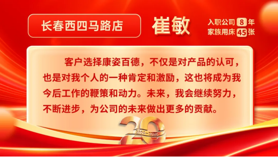 康姿百德20周年專賣店員工的系列故事會持續(xù)推出,讓我們一起期待其他地區(qū)專賣店員工代表的精彩故事吧!
