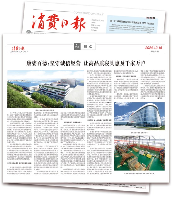 《消費(fèi)日報(bào)》由國務(wù)院國有資產(chǎn)監(jiān)督管理委員會舉辦,中國輕工業(yè)聯(lián)合會主管主辦,是我國消費(fèi)領(lǐng)域中一張全國性、全方位、大容量的綜合性日報(bào)。其立足消費(fèi)領(lǐng)域,依托輕工行業(yè),面向城鄉(xiāng)市場,最先發(fā)布相關(guān)的專業(yè)權(quán)威信息以及消費(fèi)景氣預(yù)報(bào)。近日,消費(fèi)日報(bào)以《康姿百德:堅(jiān)守誠信經(jīng)營 讓高品質(zhì)寢具惠及千家萬戶》為題,對康姿百德進(jìn)行了專題報(bào)道。