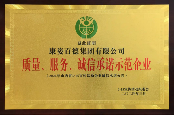 康姿百德被山西315宣傳活動(dòng)組委會(huì)授予“質(zhì)量 服務(wù) 誠信承諾示范企業(yè)”榮譽(yù)稱號(hào)
