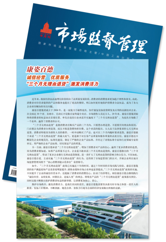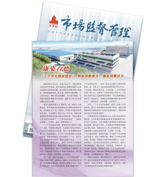 今年12月,《市場監(jiān)督管理》半月刊專題報(bào)道再次以《康姿百德“三個(gè)月無理由退貨”--釋放消費(fèi)潛力 激發(fā)消費(fèi)活力》為題,全面、詳細(xì)地報(bào)道了康姿百德。《市場監(jiān)督管理》半月刊對(duì)康姿百德的多次專題報(bào)道,是對(duì)康姿百德的認(rèn)可,也是激勵(lì)??底税俚聦⒁蝗缂韧貓?jiān)持誠信經(jīng)營,不斷提升產(chǎn)品和服務(wù)質(zhì)量,為寢具市場在保障消費(fèi)者權(quán)益方面做出表率,帶動(dòng)更多企業(yè)推行無理由退貨制度,為經(jīng)濟(jì)高質(zhì)量發(fā)展做出新的貢獻(xiàn)。